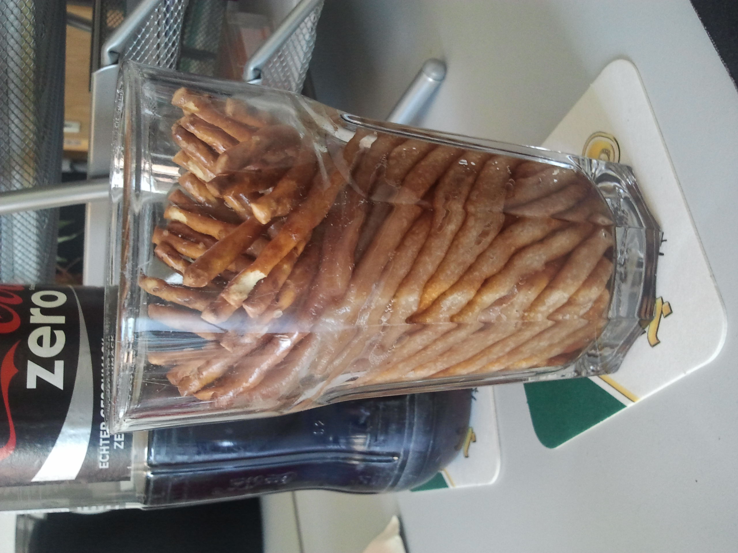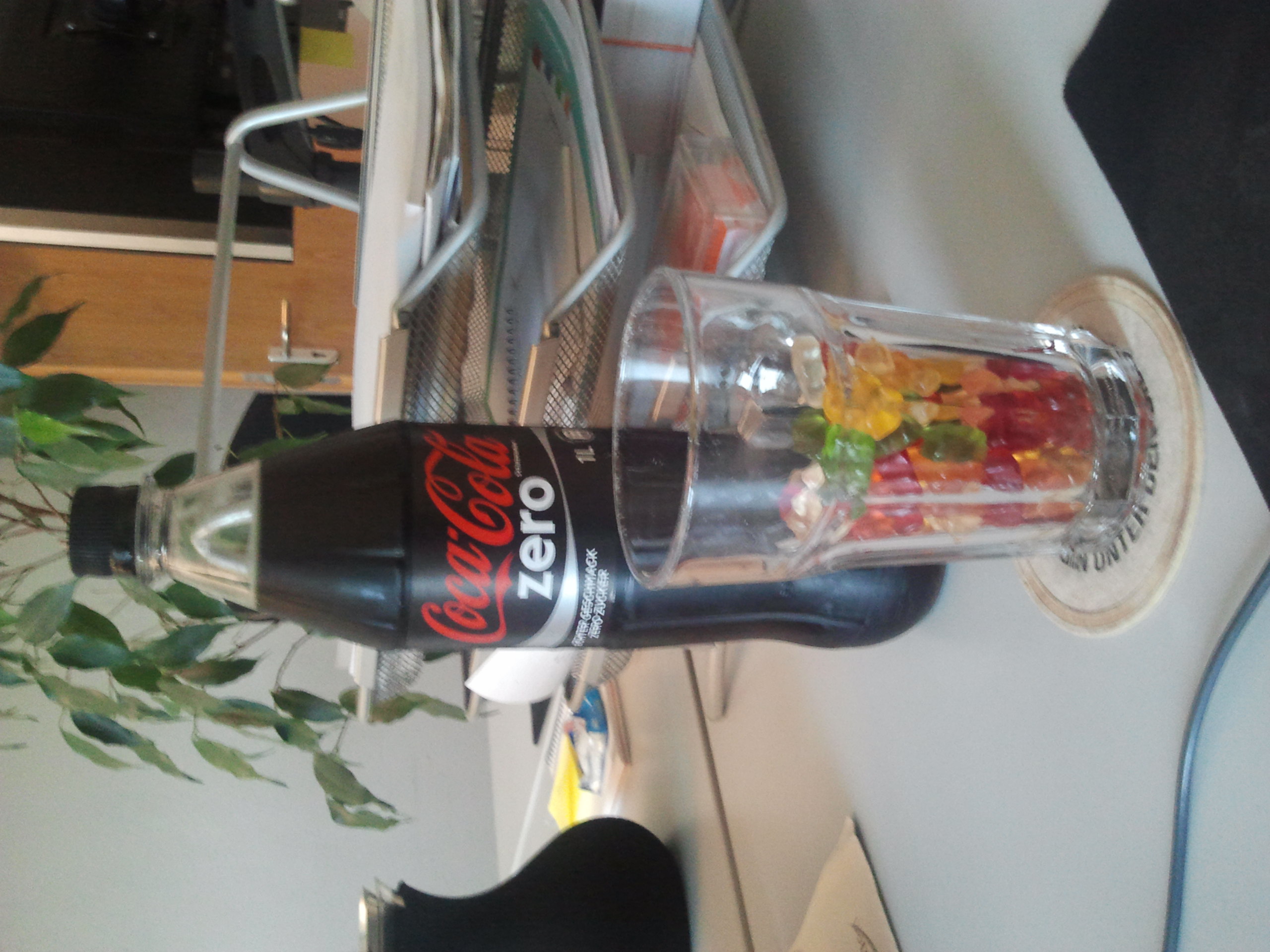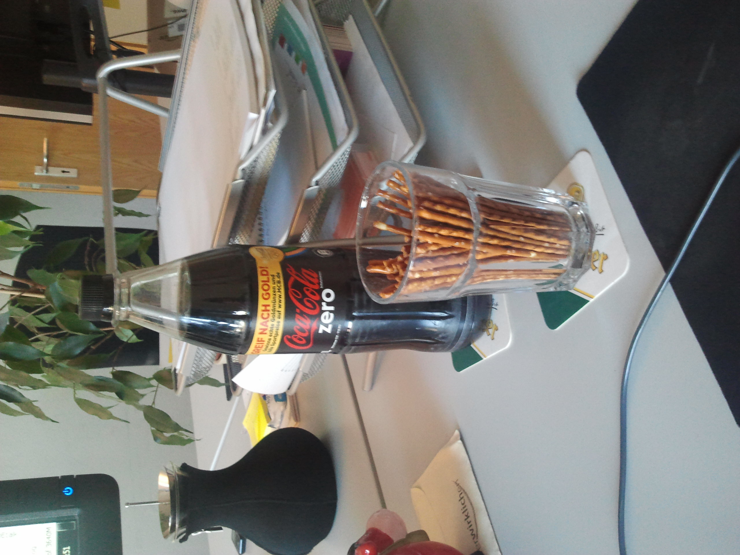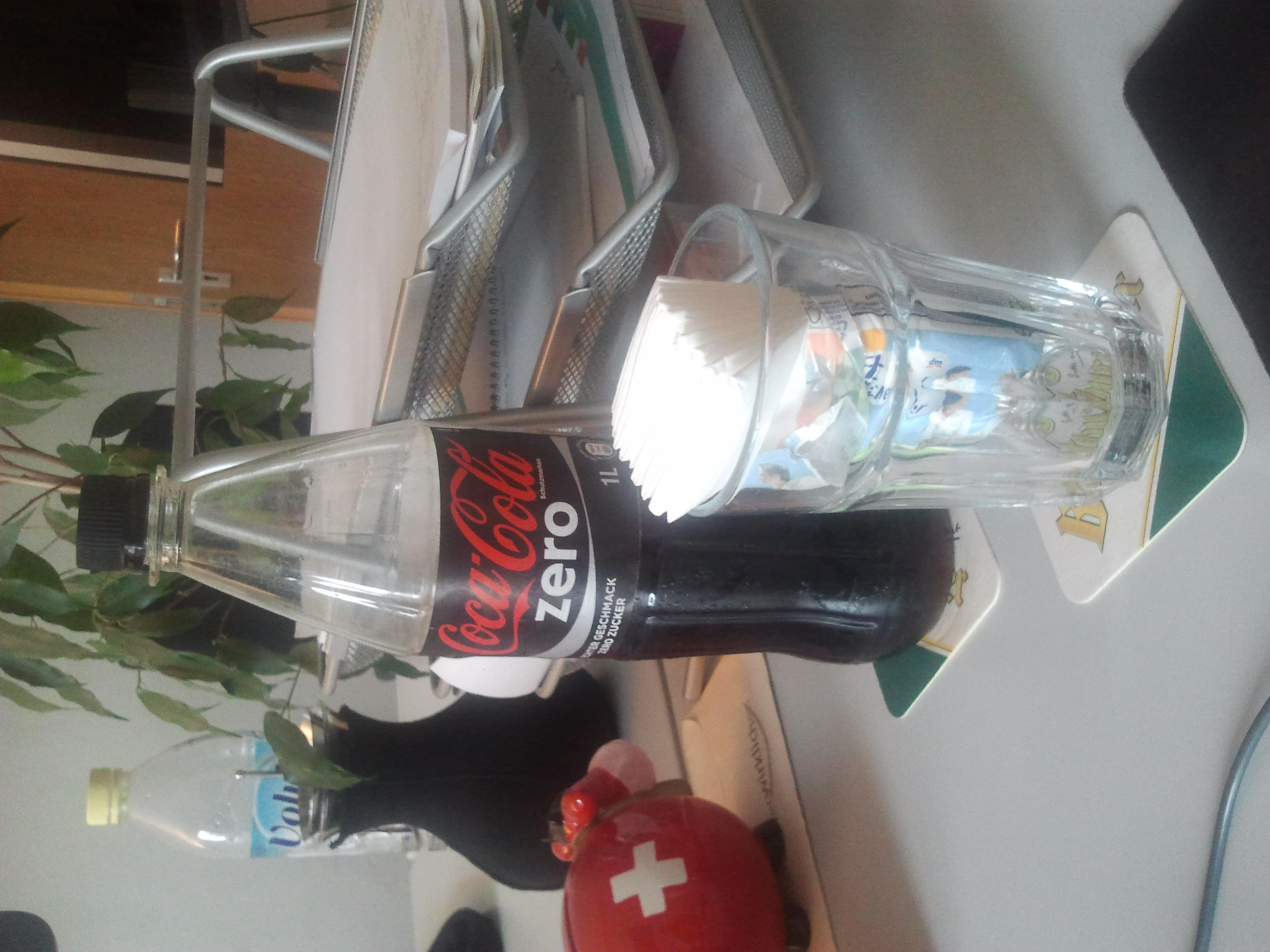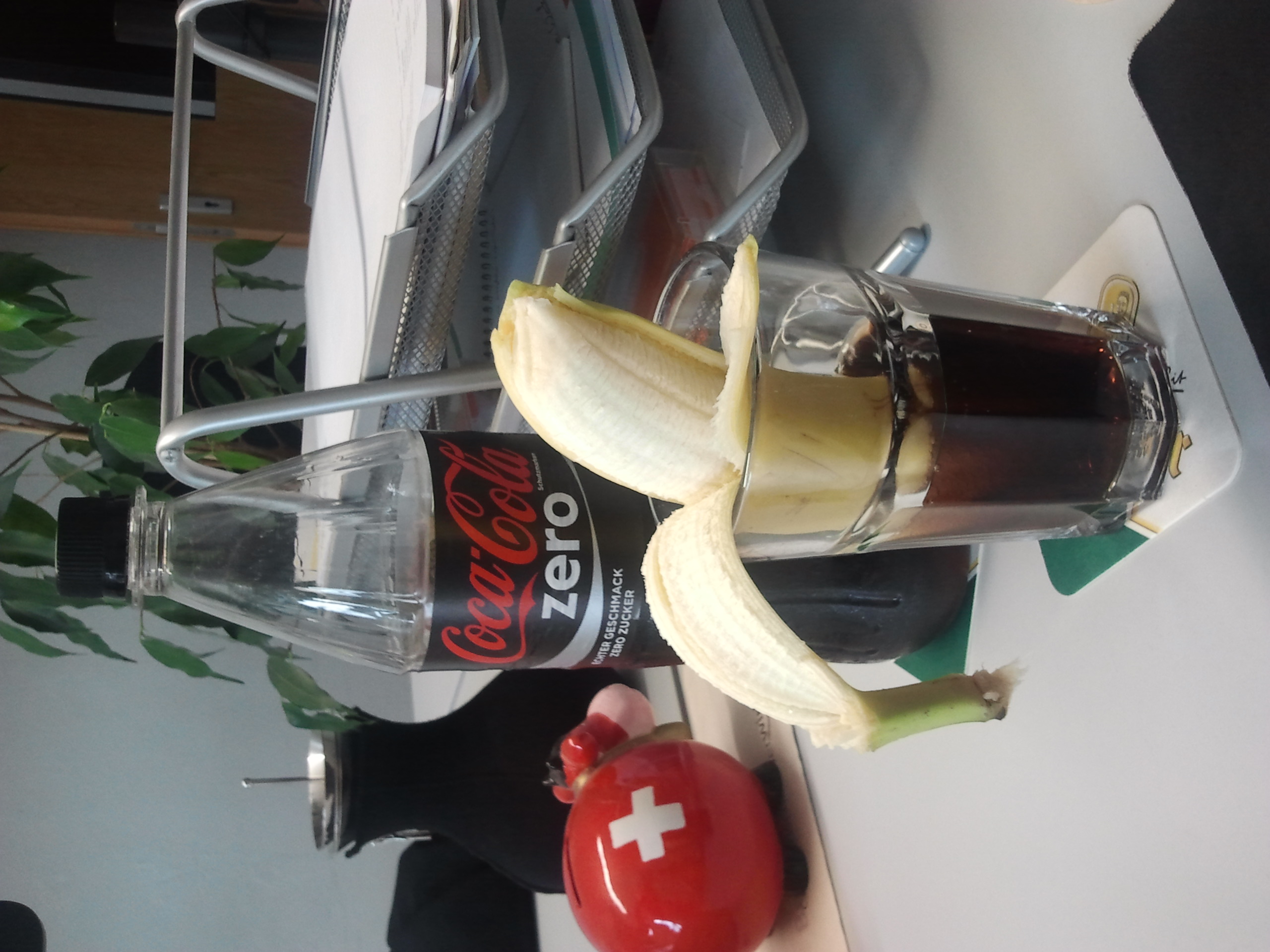 Das Grundsetting habe ich anschließend (zumeist) beibehalten, mit den Kernelementen der Flasche Zero, einem mehr oder weniger gut gefüllten Glas, der Briefablage, einer Termosteekanne, der Pflanze und der Schweizer Sparkuh. Aus am Anfang noch frei kombinierten Inhalten wurden schließlich “geflügelte” Worte. Und, frei nach Magritte, dies ist keine Coke.
